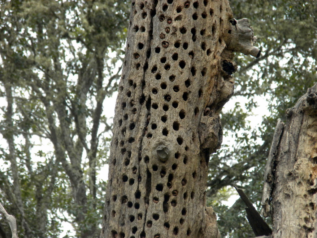 A dead tree stump that has holes from an acorn woodpeckers. The woodpecker drills the holes and places acorns in them. They wait for them to get wormy and then they come back for lunch.